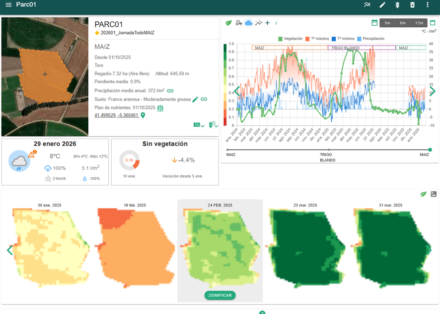 Entre sus funcionalidades vinculadas a la teledetección, destaca el seguimiento de parcelas mediante imágenes de satélite Sentinel-2 del programa Copernicus, que permite analizar la evolución espacial y temporal de los cultivos, evaluar su crecimiento y senescencia, detectar anomalías que afectan a la totalidad de la parcela o a zonas concretas, e identificar zonas singulares o rodales dentro de una misma parcela. Estas capacidades facilitan la realización de comparativas espaciales entre parcelas de la propia explotación o de otras explotaciones, contribuyendo a la identificación de buenas prácticas agronómicas.